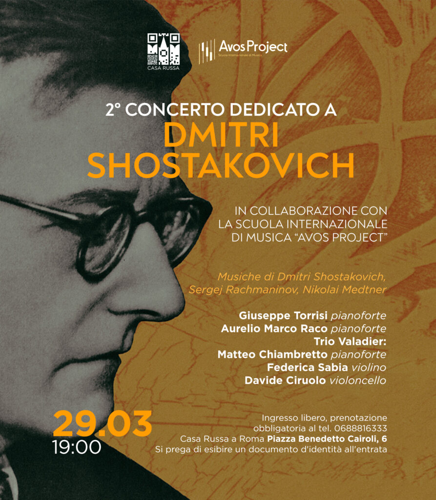 The Russian House in Rome continues the project dedicated to Dmitri Shostakovich in the year of the 50th anniversary of the death of the composer of the legendary “Leningrad Symphony.” On Saturday, March 29 at 7 p.m., students of the International School of Music “AVOS Project” (Rome) will present to the audience a program consisting of works by Dmitri Shostakovich, Sergei Rachmaninov and Nikolai Medtner. Giuseppe Torrisi (piano), Aurelio Marco Raco (piano) and the Trio “Valadier ”represented by Matteo Ciambretto (piano), Federica Sabia (violin) and Davide Ciruolo (cello) will perform.
