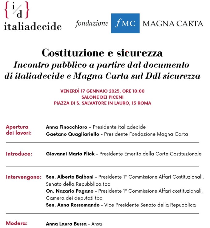 January 17th will be the opportunity to discuss the Security bill, with the Italia Decide Association and the Magna Carta Foundation which have been working for many years in a spirit of collaboration with parliamentary and government institutions and carry out their own study work, reflection and proposal to contribute to the quality of public policies, their effectiveness, and consistency with constitutional principles.