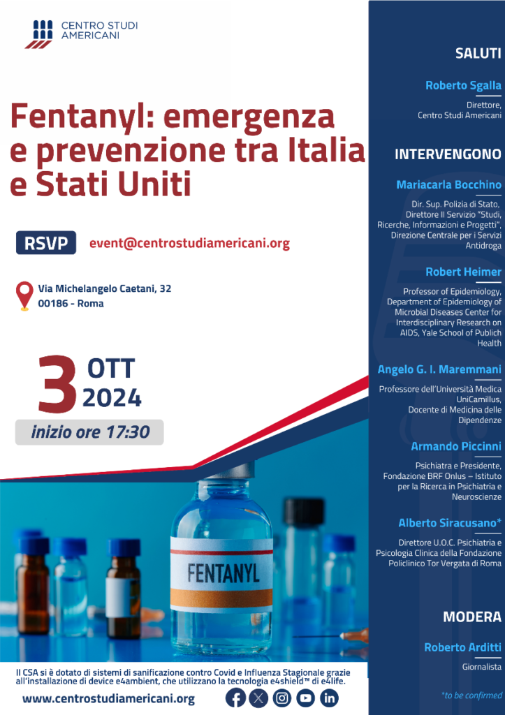 The event entitled ‘Fentanyl: emergency and prevention between Italy and the United States’ will be held on 3 October at 5.30 p.m. at Centro Studi Americani in Via Michelangelo Caetani 32 in Rome.