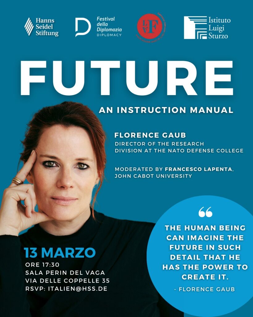 The Hanns Seidel Foundation organizes a meeting/conference entitled “Future” with Florence Gaub (director of research division at the Born Defense College) at the Don Luigi Sturzo Institute in collaboration with the Friends of Luigi Vittorio Ferraris Association.