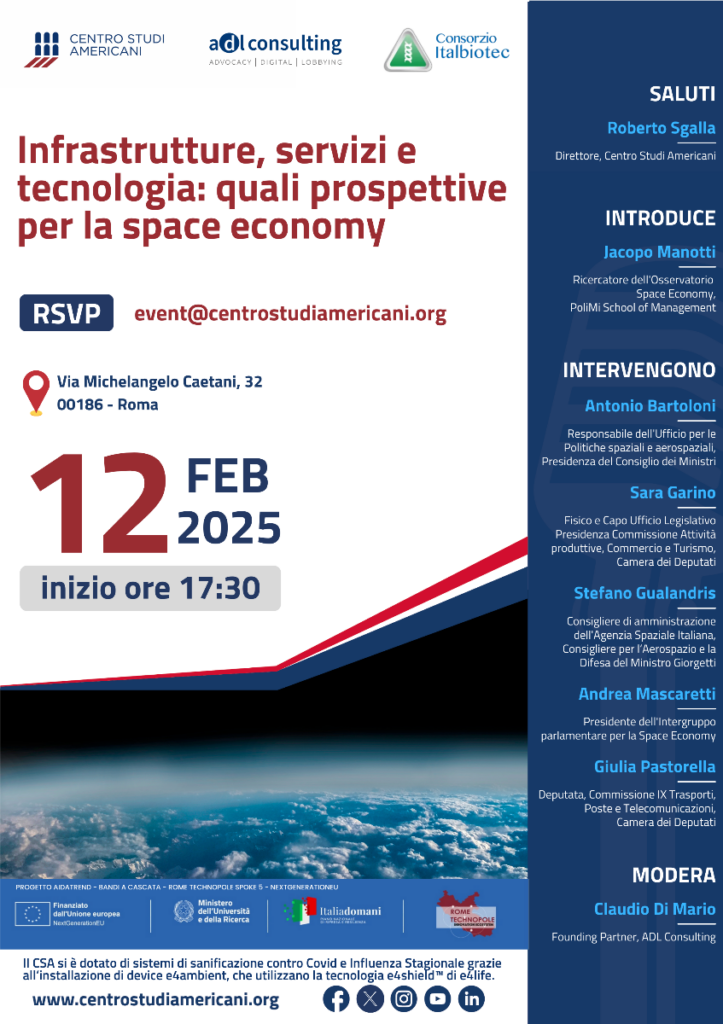 The meeting to talk about “Infrastructures, services and technology: what prospects for the space economy” will be held at the American Studies Center on February 12th at 5.30 pm.
