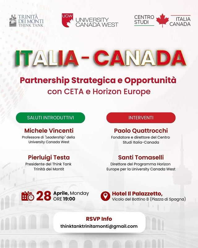 The meeting “Italy – Canada: Strategic Partnership and Opportunities with CETA and Horizon Europe” will be held on Monday, 28 April, at 7 pm, organized by the Trinità dei Monti Think Tank, University Canada West and the Italy-Canada Study Centre.