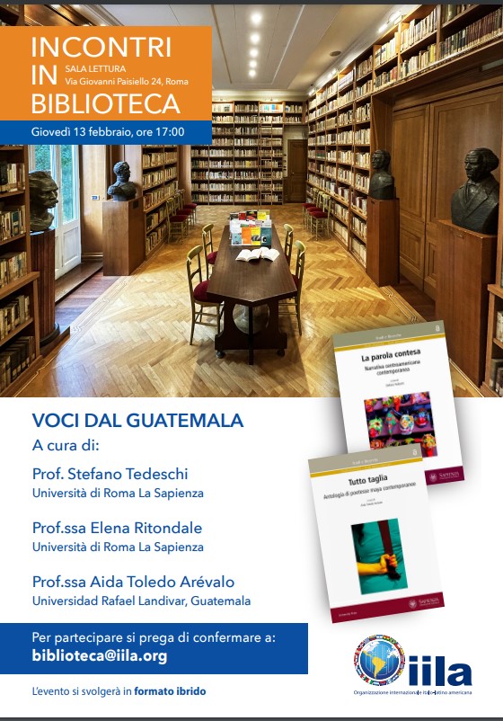 Appointment with the usual IILA column dedicated to books. “Meetings in the Library – Voices from Guatemala” will be held at the Library of the Institute of Latin American Culture on February 13th at 5 pm. To participate it is necessary to register by sending an email to: biblioteca@iila.org