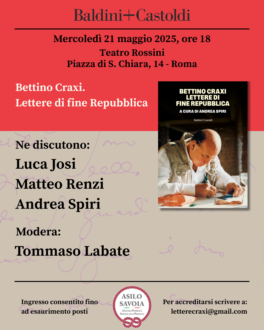 On Wednesday, May 21 at 6 p.m., the book, “Bettino Craxi. Letters from the End of the Republic” published by Baldini+Castoldi publishing house. The event will be held at Teatro Rossini, at the Palazzo di Santa Chiara (Piazza di S. Chiara, 14).