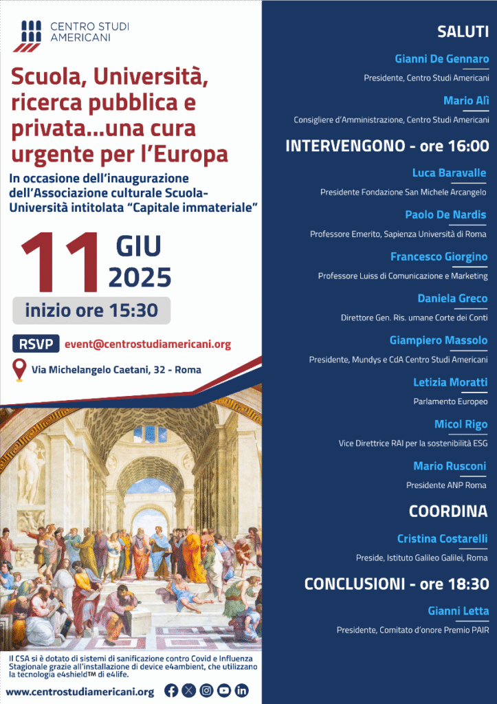 On 11 June at 3.30 p.m., the event ‘School, University, public and private research…an urgent cure for Europe’ will be held, organised on the occasion of the inauguration of the School-University Cultural Association entitled ‘Intangible Capital’.