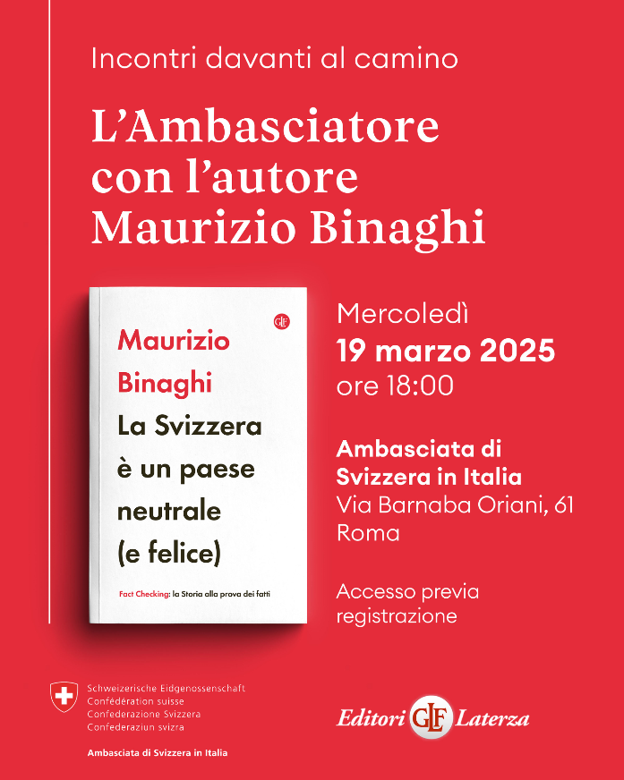 A discussion meeting on the book “Switzerland is a neutral (and happy) country” by Maurizio Binaghi will be held on Wednesday, March 19, beginning at 6 p.m. at the Swiss Embassy headquarters. The meeting, reserved to guests, will also be attended by newly appointed ambassador H.E. Roberto Balzaretti