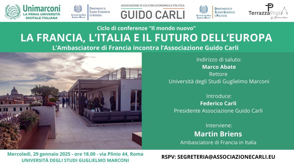 The French Ambassador to Italy, Martin Briens, will take part in one of the sessions of the conference cycle ‘The New World – France, Italy and the Future of Europe’, promoted by Unimarconi and the Guido Carli Association. The meeting will be held on Wednesday 29 January, at 6 p.m., at the digital university’s premises in Via Plinio, 44 in Rome.