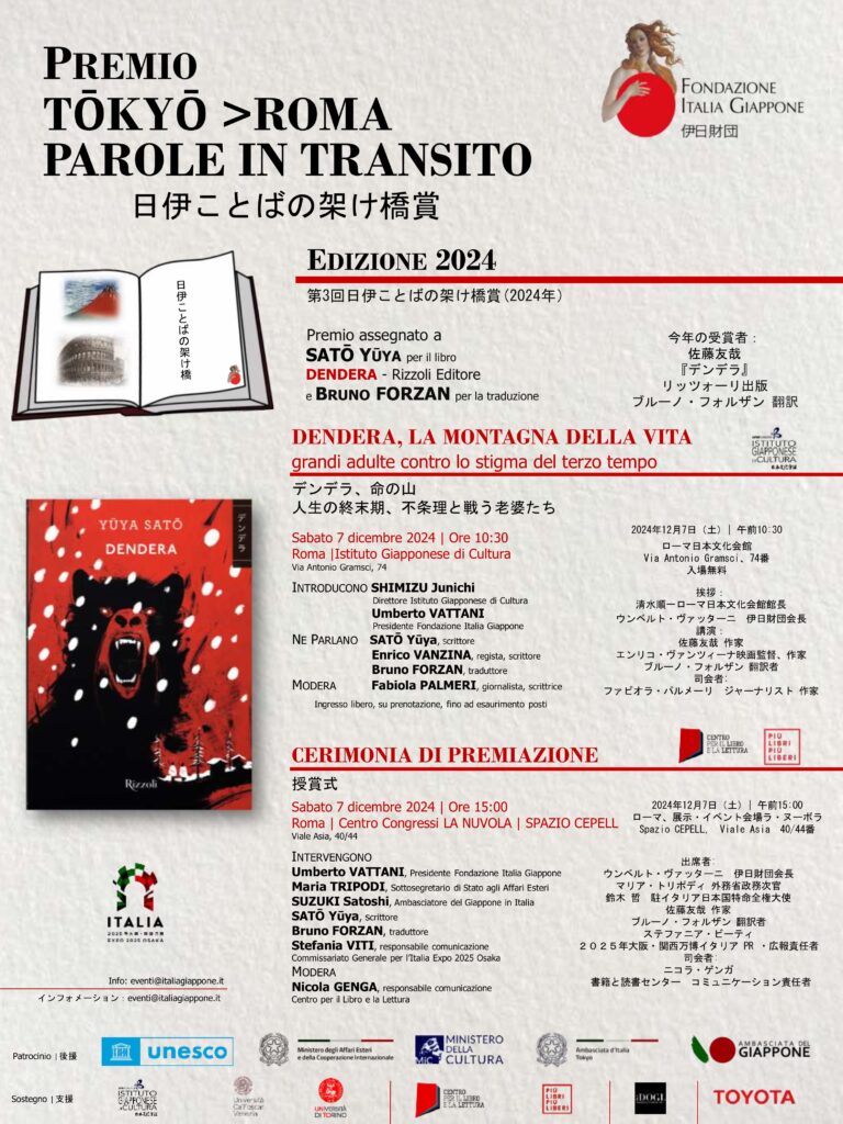 On Saturday 7 December 2024 in Rome, at 3.00 p.m., as part of the event ‘Più libri Più liberi’ (More books More freedom) in Sala Cepell, at the Centro Congressi La Nuvola, the Award Ceremony of the Literary Prize ‘Tōkyō-Roma. Parole in Transito’; now in its third edition.