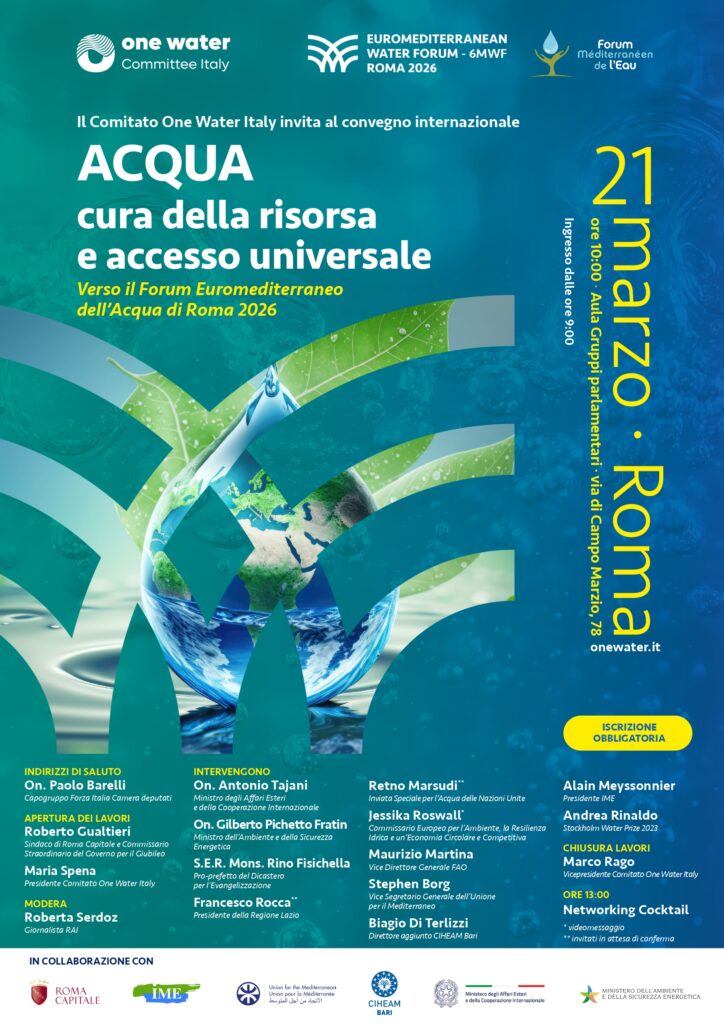 Registration is now open for the International Conference “WATER: Resource Care and Universal Access. Towards the Rome 2026 Euro-Mediterranean Water Forum” which will be held on Friday, March 21, with entrance starting at 9 a.m., in the Aula dei Gruppi Parlamentari at the Chamber of Deputies in Via Campo Marzio 78. Speakers at the conference will include Deputy Prime Minister and Minister of Foreign Affairs and International Cooperation Hon. Antonio Tajani, Minister of the Environment Hon. Gilberto Pichetto Fratin, Mayor of Rome Prof. Roberto Gualtieri, Pro-Prefect of the Dicastery for Evangelization H.E.R. Monsignor Rino Fisichella and senior representatives of International Istitutions (as per the attached program).