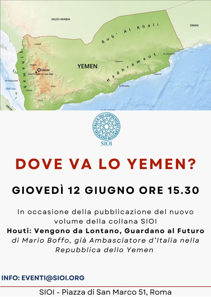 ‘Where is Yemen going?’ is the title of the meeting organised at SIOI on 12 June to mark the publication of the new volume in the SIOI Houti series: Vengono da Lontano, Guardano al Futuro by Mario Boffo, former Italian Ambassador to the Republic of Yemen.