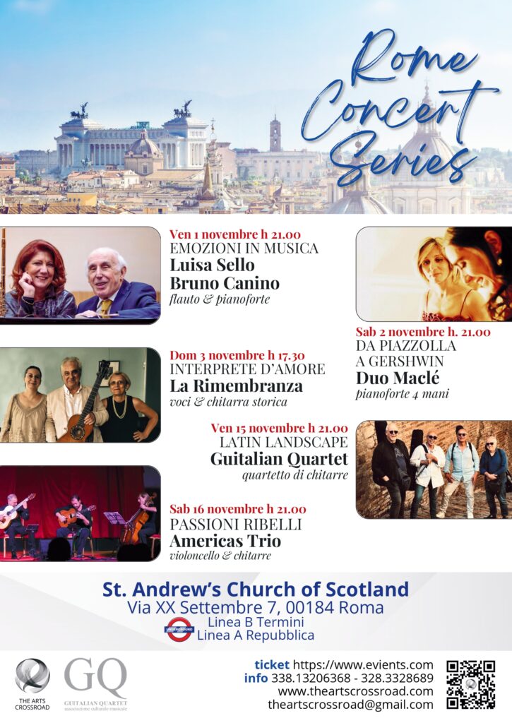 Three concerts for three evenings of music that will envelop the Scottish church of St. Andrew and thus the city of Rome. The concerts will see Luisa Sello and Bruno Canino, flute & piano, performing on Friday 1st November at 9pm, on Saturday 2nd at 9pm the Maclé Duo with pianists Sabrina Dente and Annamaria Garibaldi, and on Sunday 3rd at 5.30pm La Rimembranza, trio of voices and historical guitar, formed by Maurizia Barazzoni, Diana Corradini and Sandro Volta.