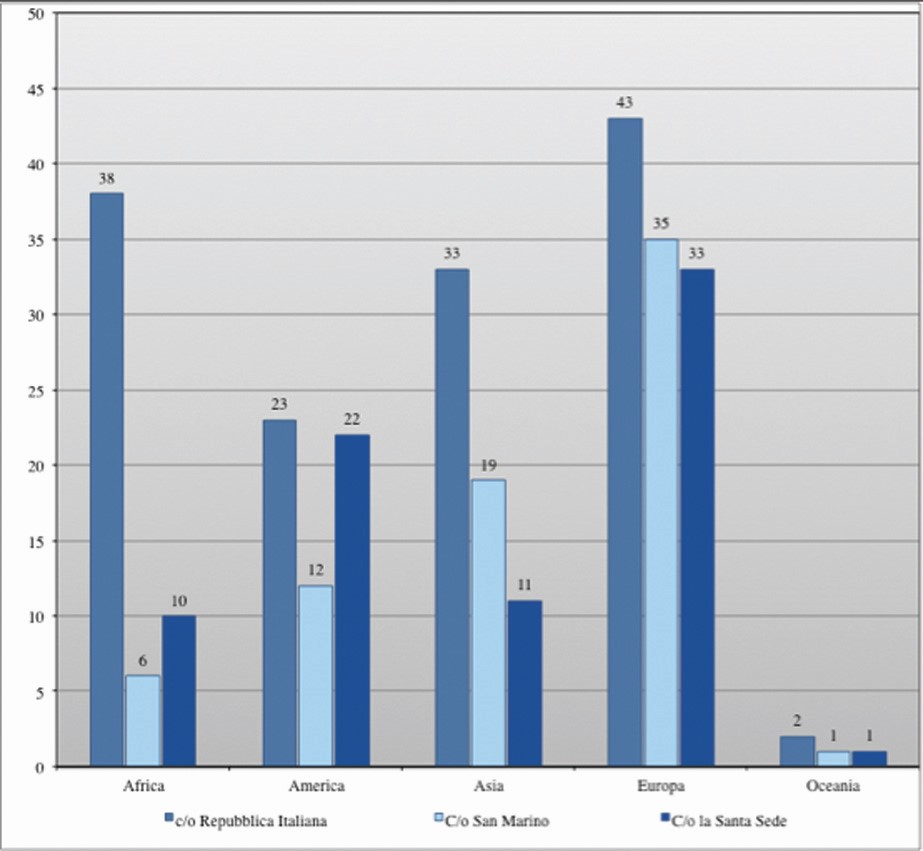 In terms of diplomatic representations to the Republic of Italy, the total number of diplomatic personnel stationed in the capital is estimated to be more than 2,300. Among the most represented states are the missions of Saudi Arabia, Algeria, Canada, China Egypt, Russia, Japan and the United States of America. While analyzing the distribution by continents of the amabsciate at our Republic, it can be seen that 43 are the European ones, 38 the African ones, 23 the American ones, 33 the Asian ones and 2 from Oceania. To compare them with respect to the representations present c/o San Marino and c/o the Holy See see the chart below