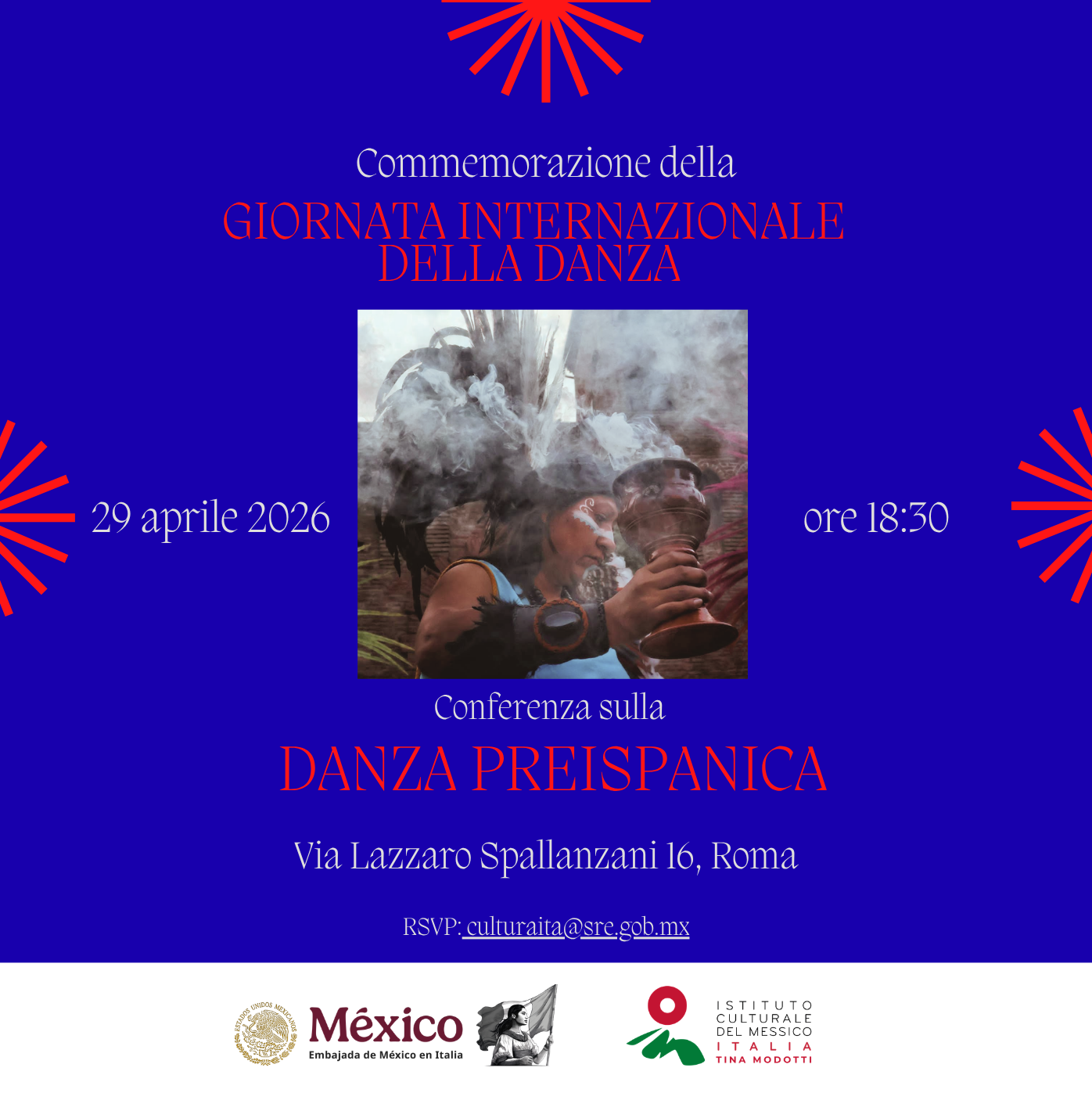 Presso l’Ambasciata Messicana di Roma il 29 aprile si terranno le celebrazioni della Giornata Internazionale della Danza con un incontro/conferenza sulla “Danza Preispanica”.