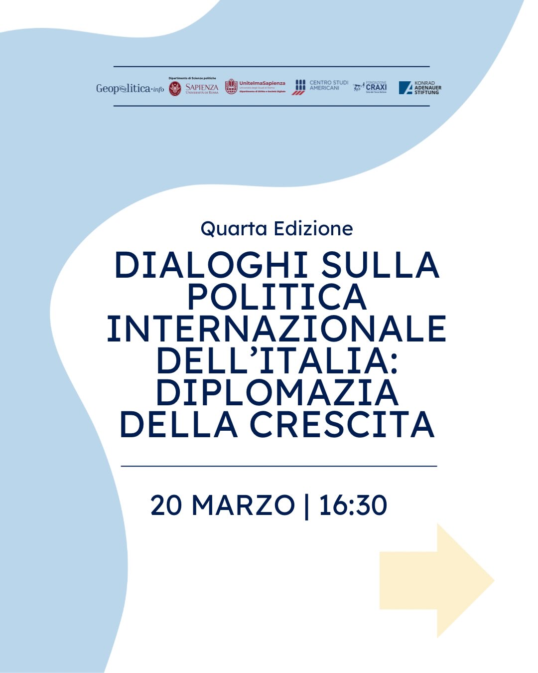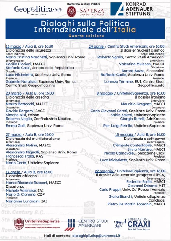 La Sapienza organizza la quarta edizione dei “Dialoghi sulla politica internazionale dell’Italia”. Saranno 8 incontri per parlare di politica internazionale dell’Italia. Di seguito il crono-programma con i vari appuntamenti e gli speaker partecipanti.