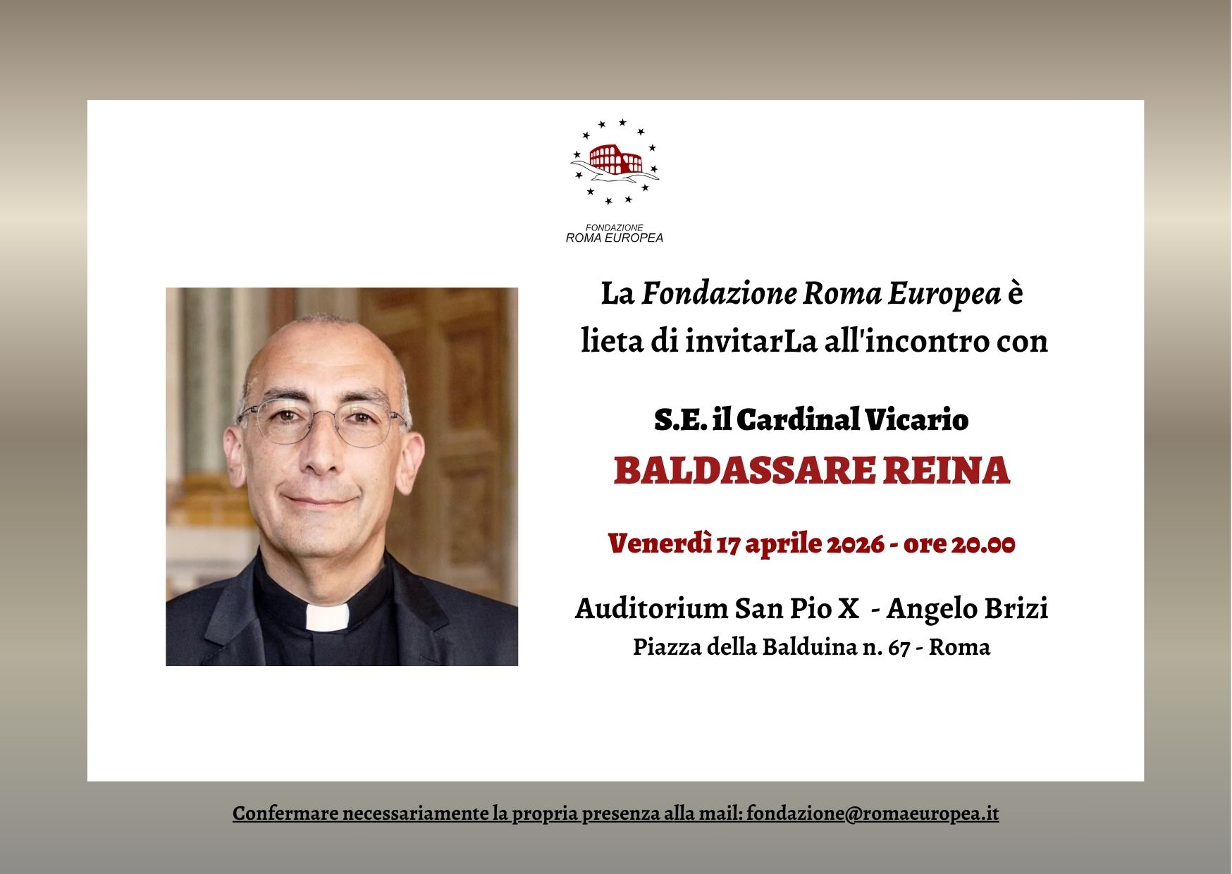 La Fondazione Roma Europea ha il piacere di invitarLa all’IV appuntamento del 2026 degli “Incontri di Roma Europea” con S.E. il Cardinal Vicario BALDASSARE REINA. L’incontro si terrà Venerdì 17 aprile 2026 – ore 20.00 presso l’Auditorium San Pio X – Angelo Brizi – Piazza della Balduina n. 67 – Roma