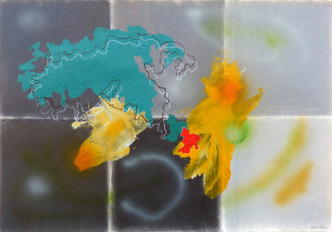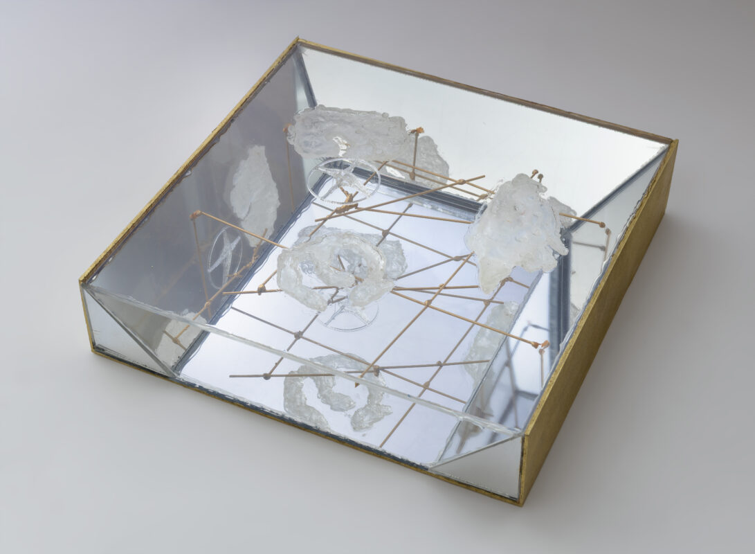 Nella serie “Vetrine” troviamo la confluenza di numerosi materiali come legno, acciaio, vernice, acrilico a specchio, in cui sono presenti elementi transitori riflessi, nuvolette e segmenti che suggeriscono direzioni incrociate e contrapposte. Vengono esposte anche incisioni in b/n e pitture su carta a colori accesi, che simulano mappe fluttuanti.